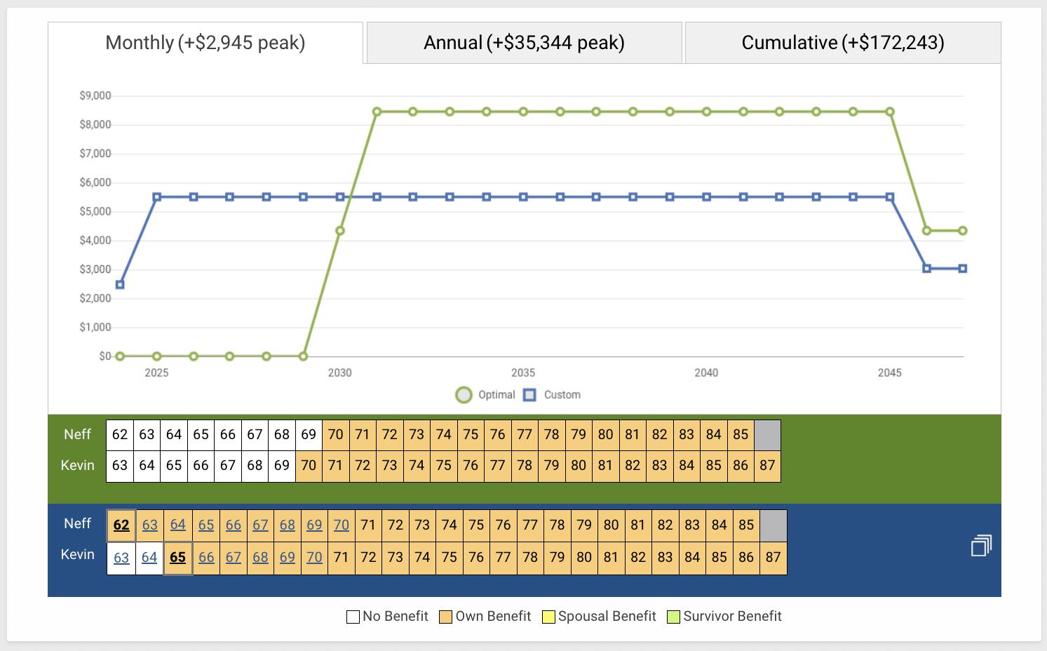 Our Personal Social Security Report will analyze your various options and show you the benefits at various ages and create a custom strategy for you to maximize your benefits